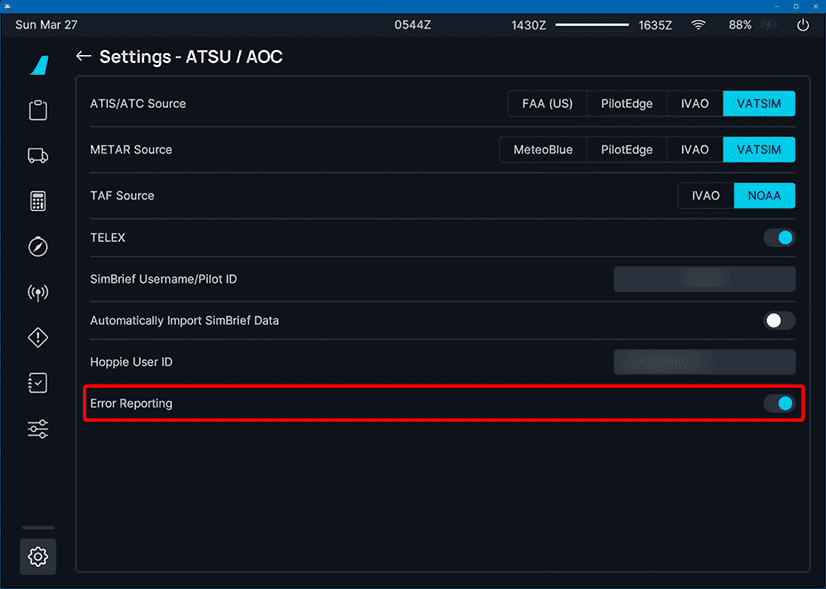 While using our aircraft, you can help us to identify errors by turning on Error Reporting. This is completely optional and anonymous.