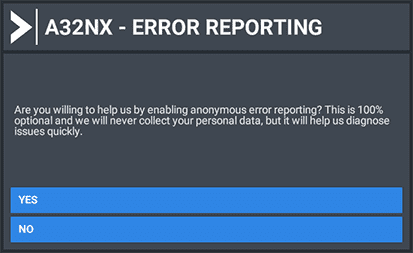 The first time you start the aircraft after this feature has been included and also every time you enable Error Reporting, you will see a confirmation dialog where you need to click on Yes.