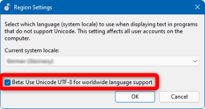• Make sure the check mark next to Beta: Use UTF-8 for worldwide language support is selected.