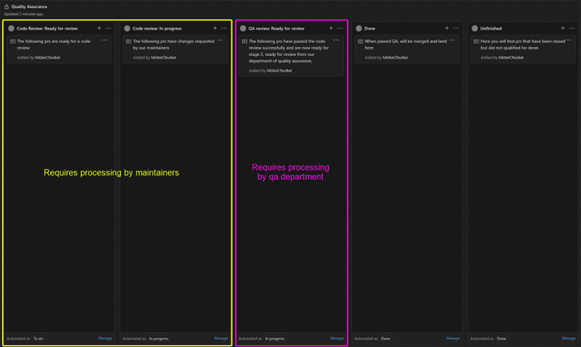 This is a simple Kanban board where items move from the left to the right. For QA tests, the third column is relevant ("QA Team Review: Ready to Test")