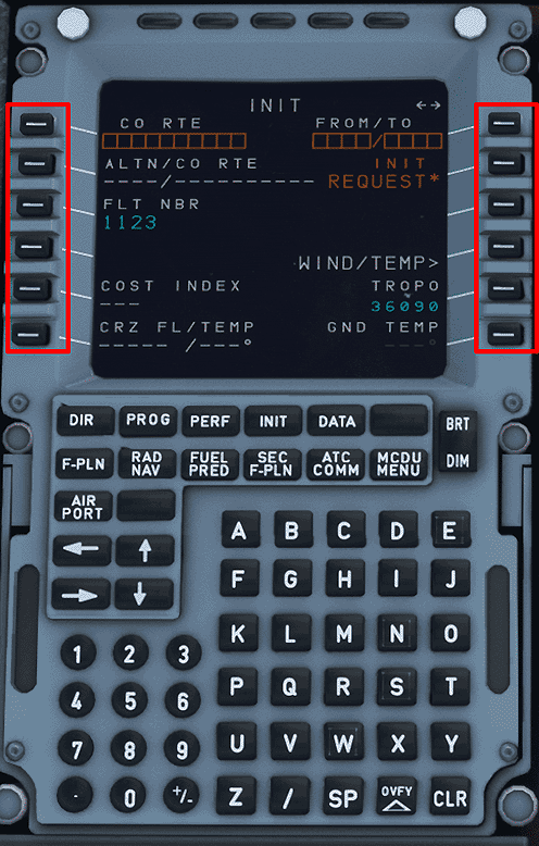 LSK for short. These keys are on the left and right-hand side of the MCDU screen. They are highlighted in the image below.