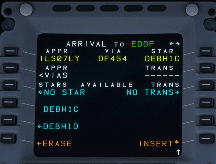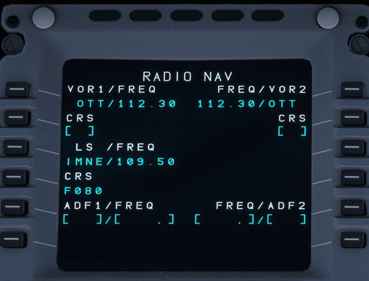 Remember, our arrival airport/rwy is EDDF/07L with ILS07L having a frequency of 110.30. When inputting a frequency, and we are in range of the ILS, it will autopopulate the identifier and course. There is no need to fill these fields. You could also enter the identifier IFEL and it would automatically fill in the frequency. You cannot enter both at the same time, as this would result in a FORMAT ERROR.