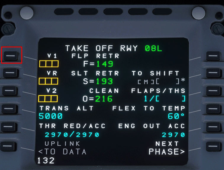 • Press LSK1L again to have the value inputted into the V1 speed. The value you get can be different from the one in the image as it depends on the weight of the aircraft.