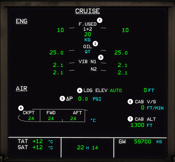 5 Cabin Differential Pressure Green ∆P Appears green when normal. Pulses green when ∆P >= 1.5 psi before landing.