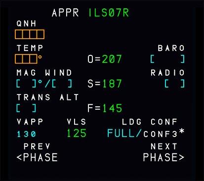 Except for the PREFLIGHT and DONE phases, each flight phase has a performance page. These pages display performance data, speeds related to the various phases, and predictions. When pressing the PERF key, the page for the currently active phase is brought up. Pages for already completed flight phases are not available anymore. In the PREFLIGHT and DONE phases, pressing the PERF key brings up the takeoff performance page.