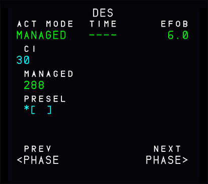 • Before the flight crew makes any entry. This field displays MANAGED in white, with the associated ECON descent Mach or speed in blue. The crew may overwrite the ECON descent Mach or speed by entering a Mach number or a speed in this field. The system uses the pilot entry to compute the descent profile. The descent may be flown in managed using this new pilot entry.