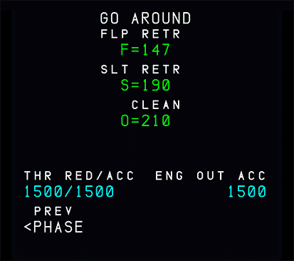When go-around is active, or if ALTN is enabled, or if a new destination is entered in the active flight plan and a new cruise flight level on the progress page, the go-around phase shifts automatically to the climb phase (target speed jumps from green dot speed to initial climb speed).