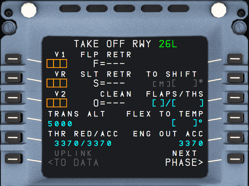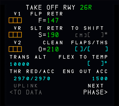 If the takeoff shift (see below) or the runway is changed after V1, V2 or VR insertion, but the origin airport remains the same, the MCDU message “CHECK TAKEOFF DATA” is displayed, but all takeoff parameters are retained.