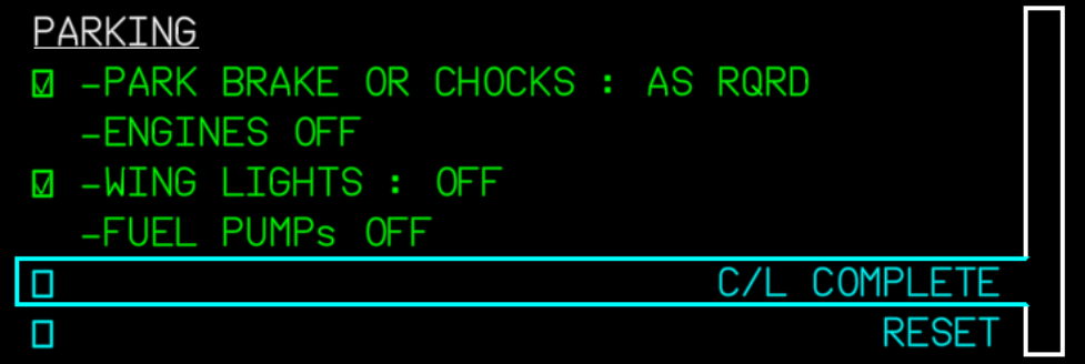 You can navigate through the checklist by using the UP and DOWN buttons on the ECP. You can check/uncheck items by pressing the buttons with the check mark on the ECP.