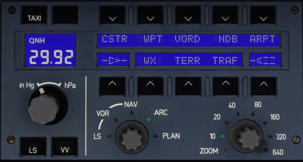 The Electronic Flight Instrument System (EFIS) lets you control what flight info shows up on the Primary Flight Displays (PFDs) and the Navigation Displays (NDs).