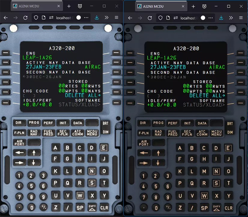 It is possible to switch between a day and night mode MCDU visualization be clicking/touching the BRT/DIM button on the Web MCDU.
