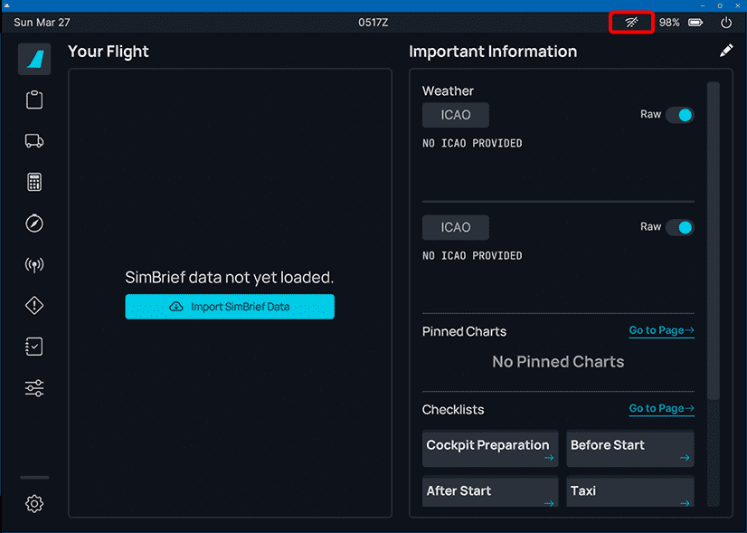 Check the connectivity status on the EFB by checking if the Wi-Fi icon on the top is crossed.