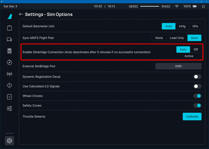 A setting in the flyPad Settings SimOptions page has been introduced to allow users to restart the connection attempts or to turn off the attempts to connect to SimBridge completely.
