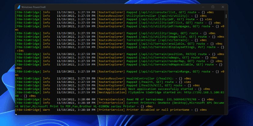The main window running SimBridge displays the server's log file information and provides important information about the started services, the necessary URLs and IP addresses.